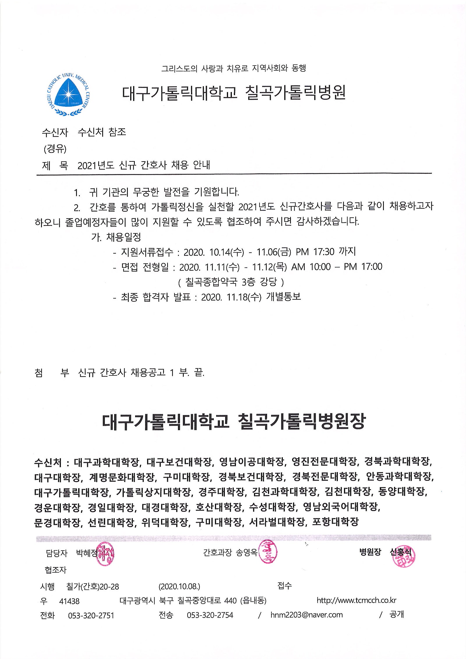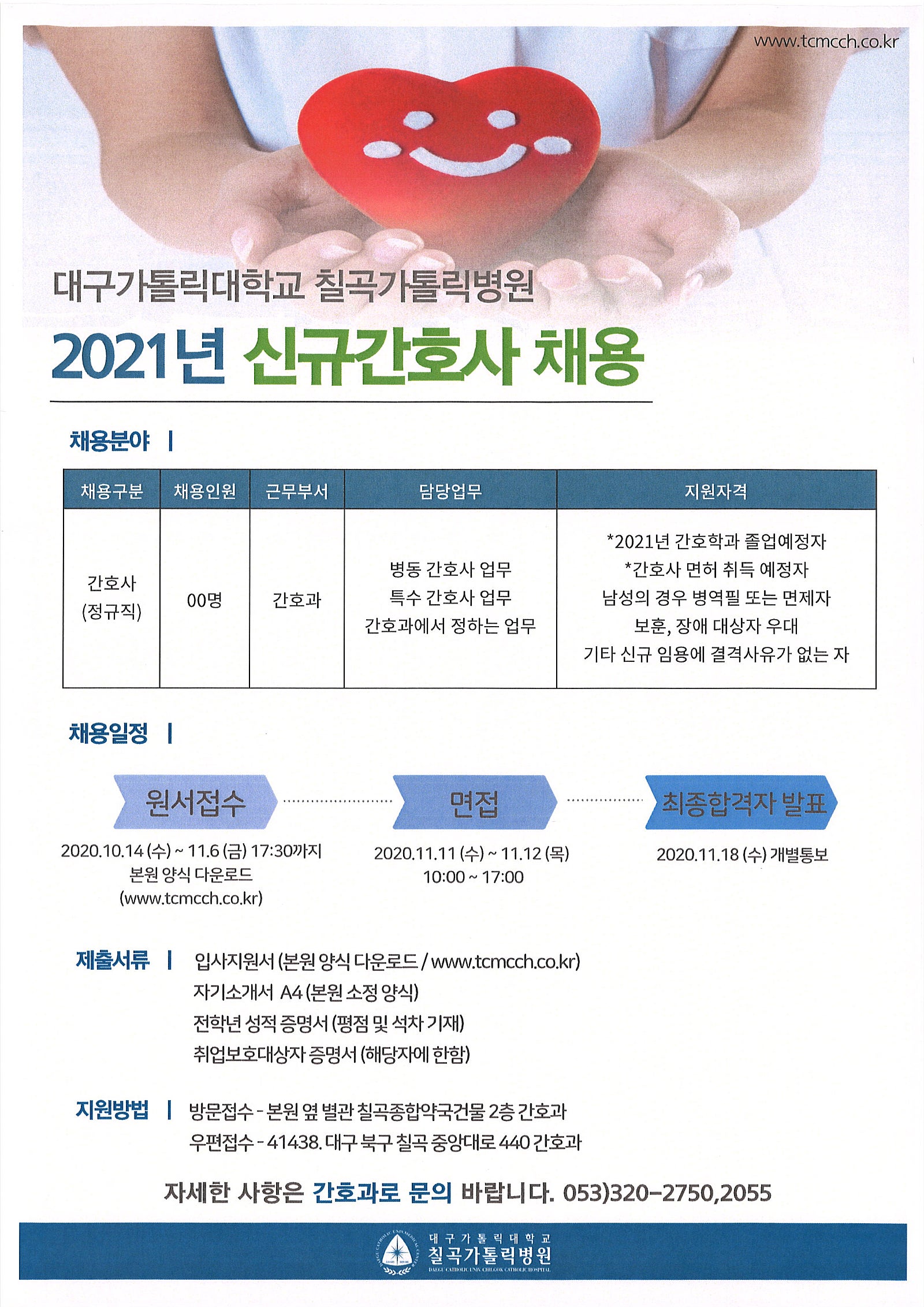 2021 대구가톨릭대학교 칠곡가톨릭병원 신규 간호사 채용 공고 페이지 정보 작성자 간호학과 댓글 0건 조회 1,907회 작성일 20-10-12 16:01 목록 본문 이전글2021 대전한국병원 신규간호사 채용 공고 20.10.12 다음글2021 녹색병원 신규간호사 채용 공고 20.10.08