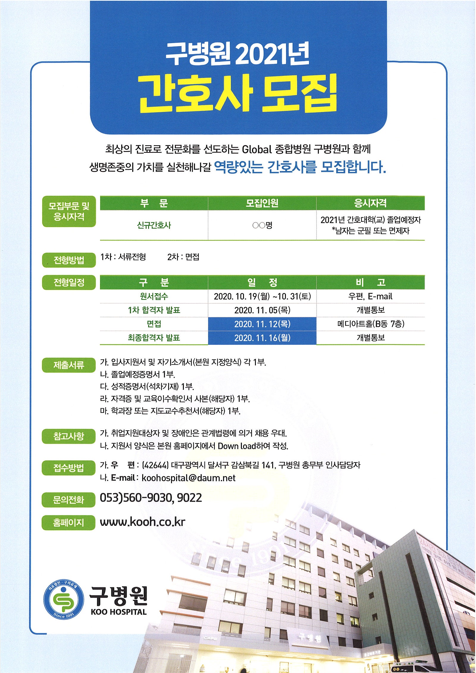 2021 구병원 신규간호사 채용 공고 페이지 정보 작성자 간호학과 댓글 0건 조회 1,971회 작성일 20-10-13 11:54 목록 본문 이전글2021 건명의료재단 진천성모병원 신규간호사 채용 공고 20.10.13 다음글2021 대전한국병원 신규간호사 채용 공고 20.10.12