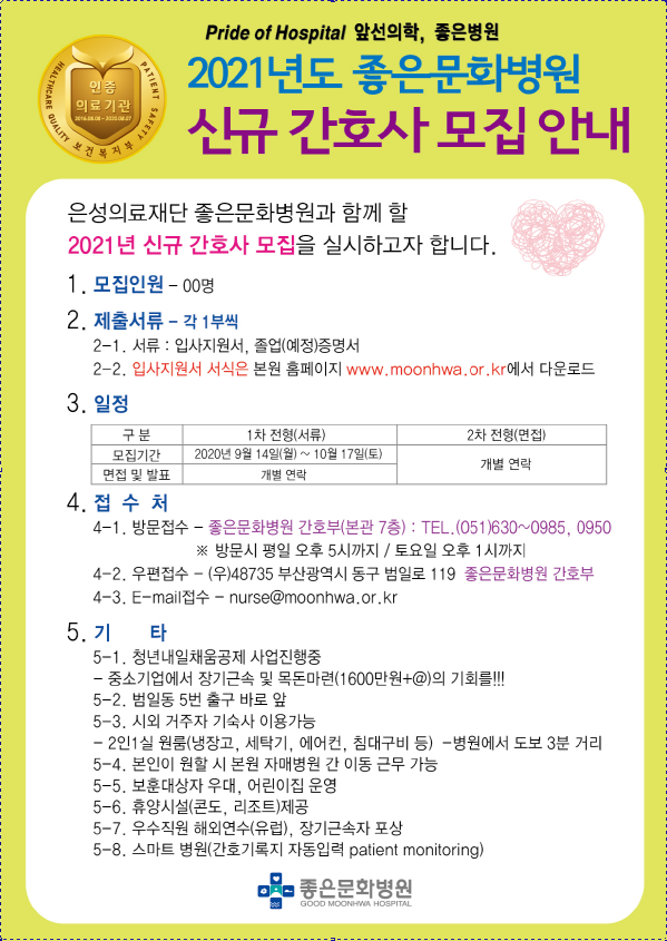 2021 좋은문화병원 신규 간호사 채용 공고 페이지 정보 작성자 간호학과 댓글 0건 조회 1,825회 작성일 20-09-14 10:05 목록 본문 이전글2021 구미차병원 신규간호사 및 경력 간호사 채용 공고 20.09.16 다음글2021 현대유비스병원 신규 간호사 채용 공고 20.09.09
