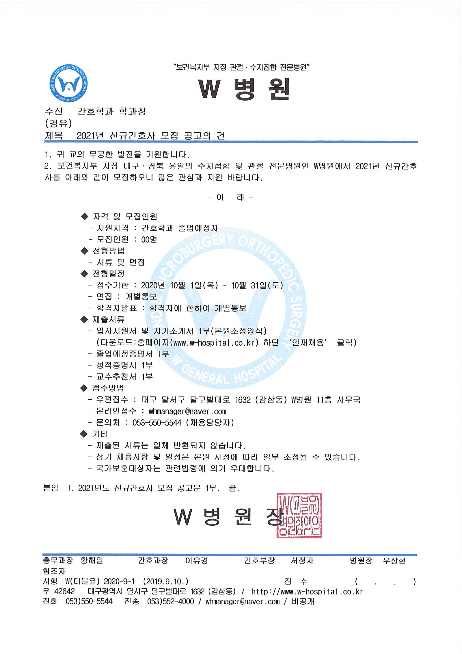 2021 W병원 신규간호사 채용 공고 페이지 정보 작성자 간호학과 댓글 0건 조회 2,046회 작성일 20-09-16 17:44 목록 본문 이전글2021 순천향대학교 구미병원 신규간호사 채용공고 20.09.16 다음글2021 구미차병원 신규간호사 및 경력 간호사 채용 공고 20.09.16