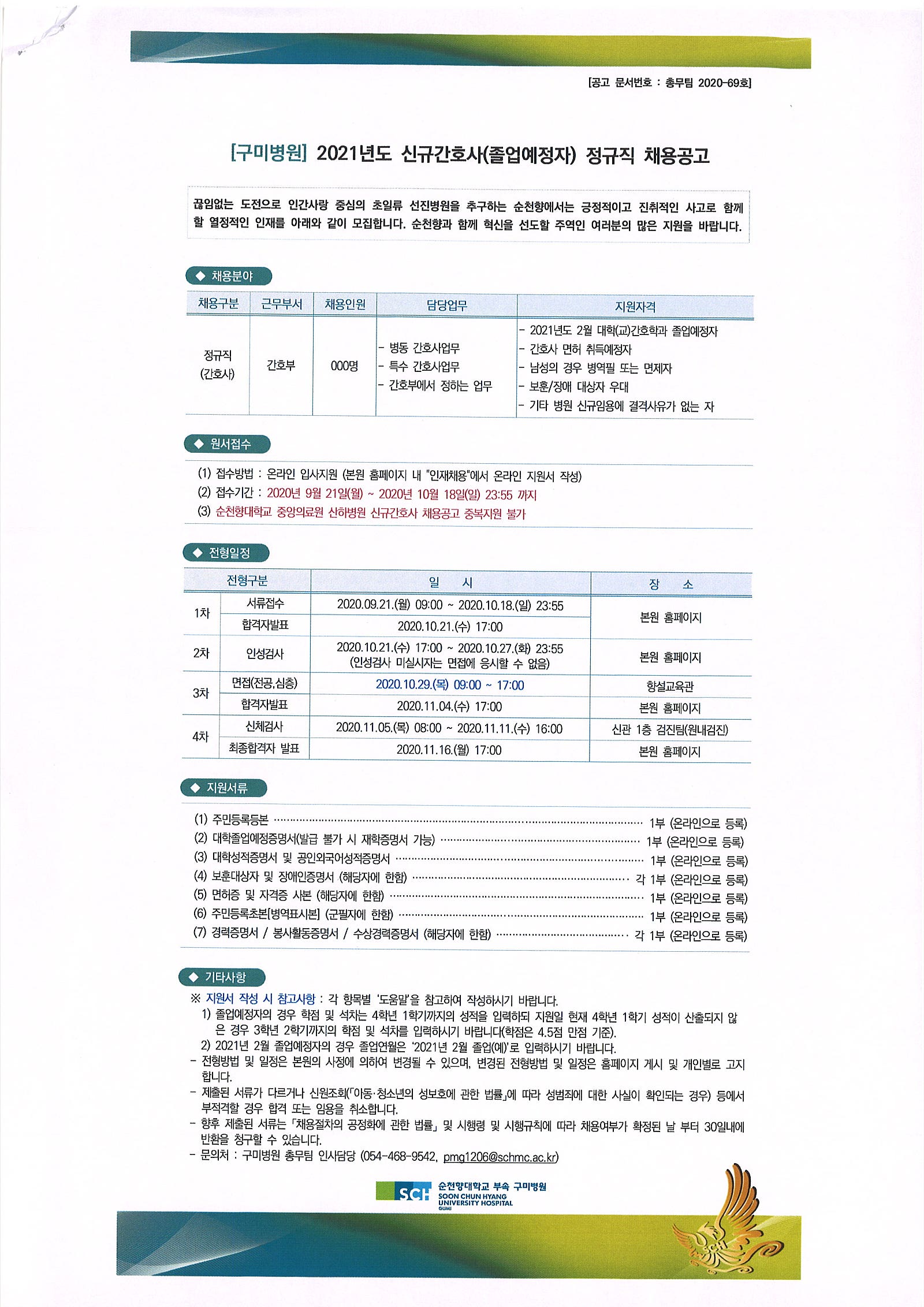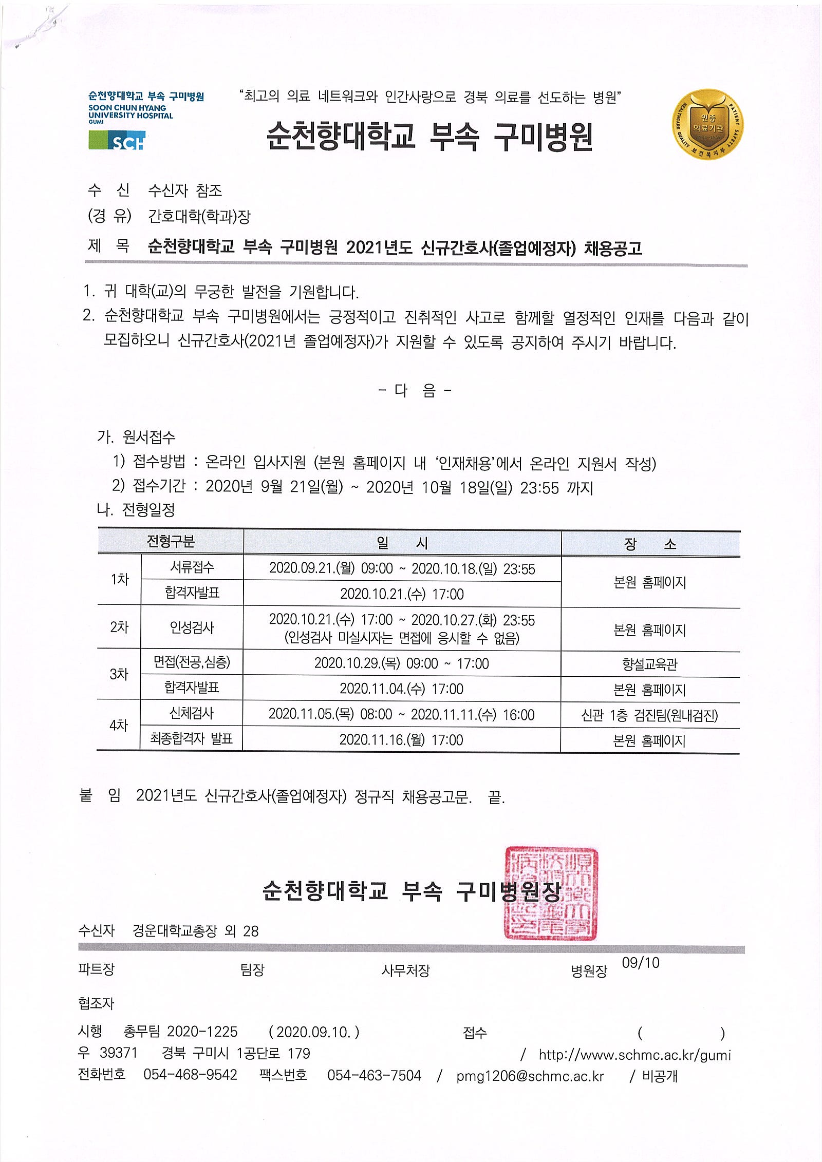 2021 순천향대학교 구미병원 신규간호사 채용공고 페이지 정보 작성자 간호학과 댓글 0건 조회 1,854회 작성일 20-09-16 17:46 목록 본문 이전글2021 나사렛국제병원 신규간호사 채용 공고 20.09.16 다음글2021 W병원 신규간호사 채용 공고 20.09.16