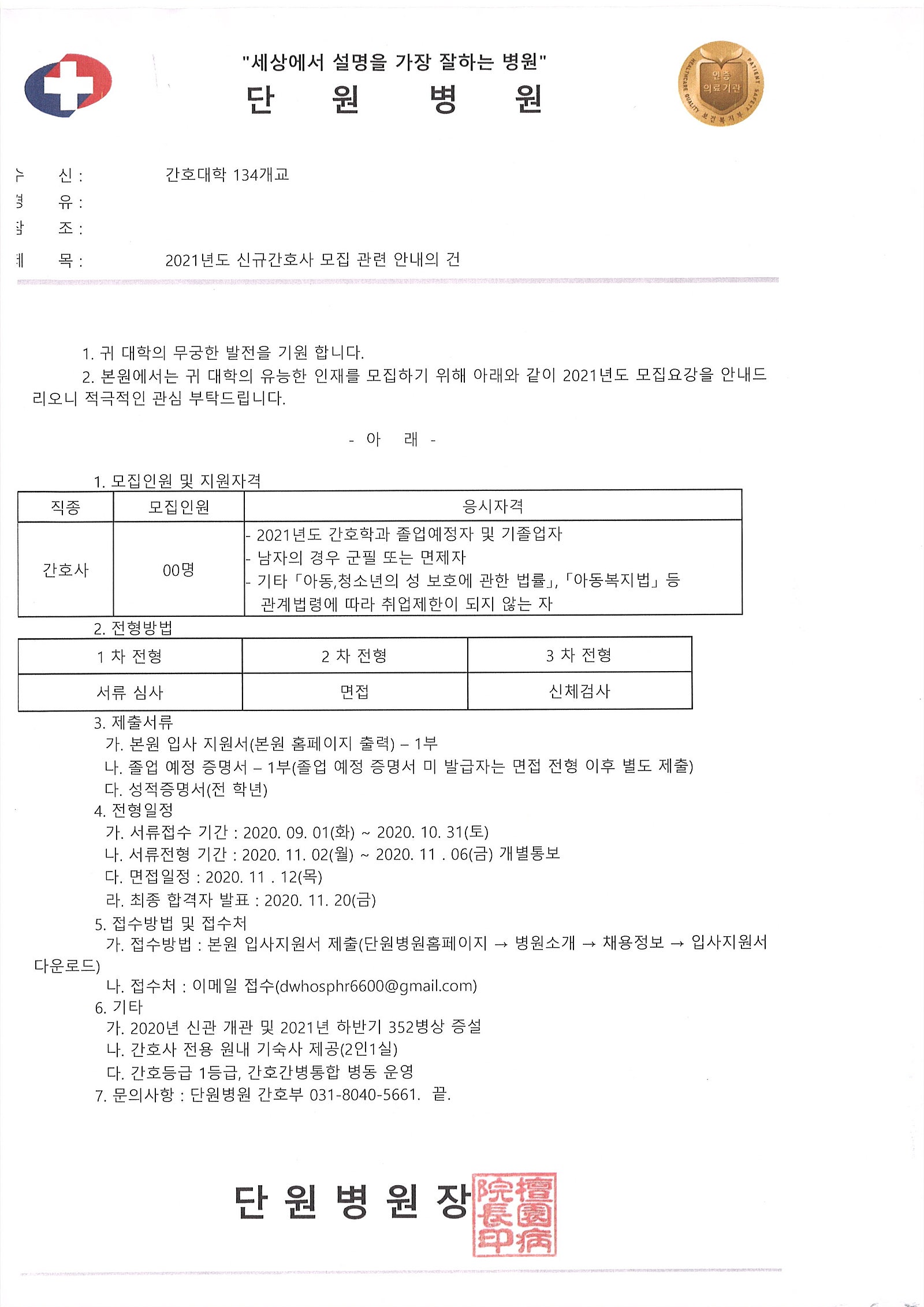 2021 단원병원 신규간호사 채용 공고 페이지 정보 작성자 간호학과 댓글 0건 조회 1,670회 작성일 20-09-16 17:49 목록 본문 이전글2021 경산중앙병원 신규간호사 모집공고 20.09.16 다음글2021 나사렛국제병원 신규간호사 채용 공고 20.09.16