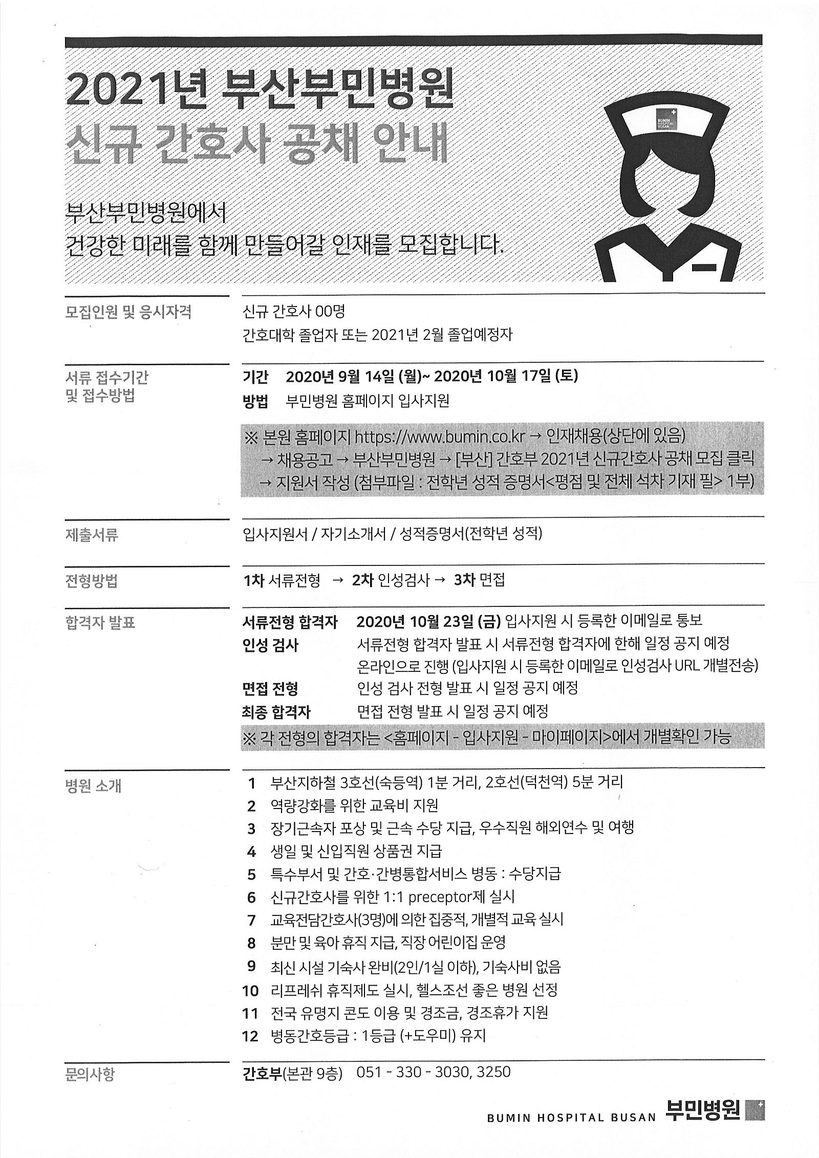 2021 부산부민병원 신규간호사 채용 공고 페이지 정보 작성자 간호학과 댓글 0건 조회 1,664회 작성일 20-09-16 17:52 목록 본문 이전글2021 동수원병원/동수원한방병원 신규간호사 채용 안내 20.09.16 다음글2021 경산중앙병원 신규간호사 모집공고 20.09.16