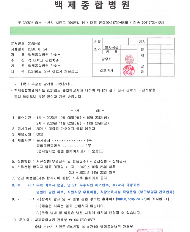 2021 백제종합병원 신규간호사 채용 공고 페이지 정보 작성자 간호학과 댓글 0건 조회 1,780회 작성일 20-08-31 11:46 목록 본문 이전글2021 에스포항병원 신규간호사 채용 공고 20.08.31 다음글2021 동의의료원 신입간호사 채용 공고 20.08.26