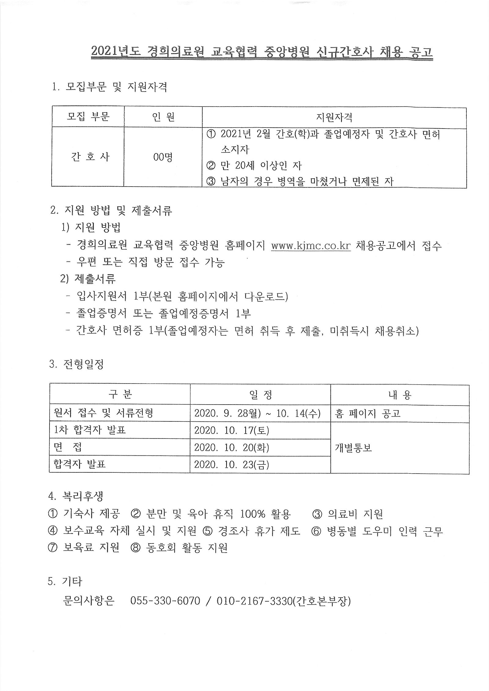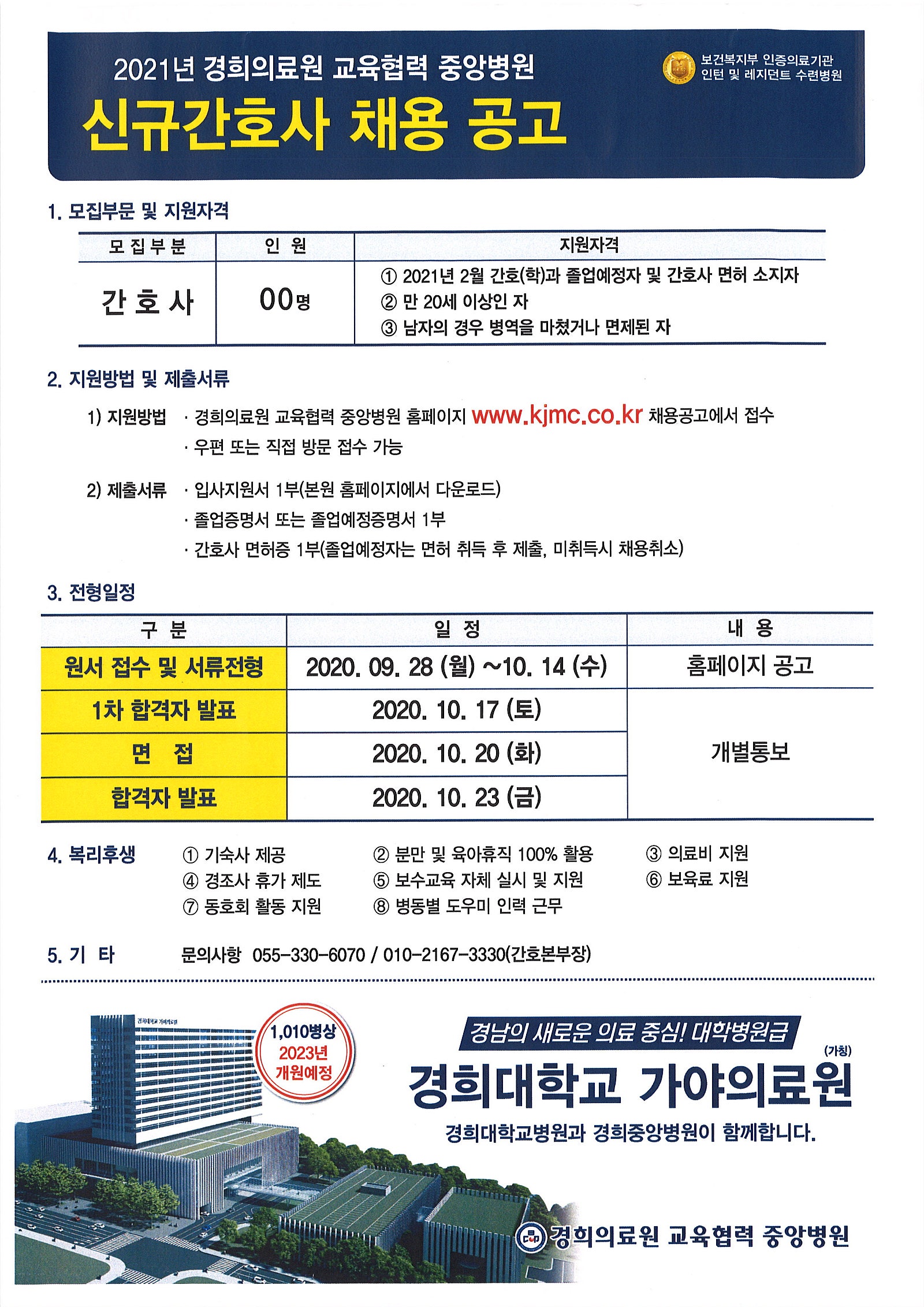 2021 경희의료원 교육협력 중앙병원 신규간호사 채용 공고 페이지 정보 작성자 간호학과 댓글 0건 조회 1,894회 작성일 20-09-02 17:28 목록 본문 이전글2021 명지성모병원 간호사 채용 안내 20.09.02 다음글2021 에스포항병원 신규간호사 채용 공고 20.08.31