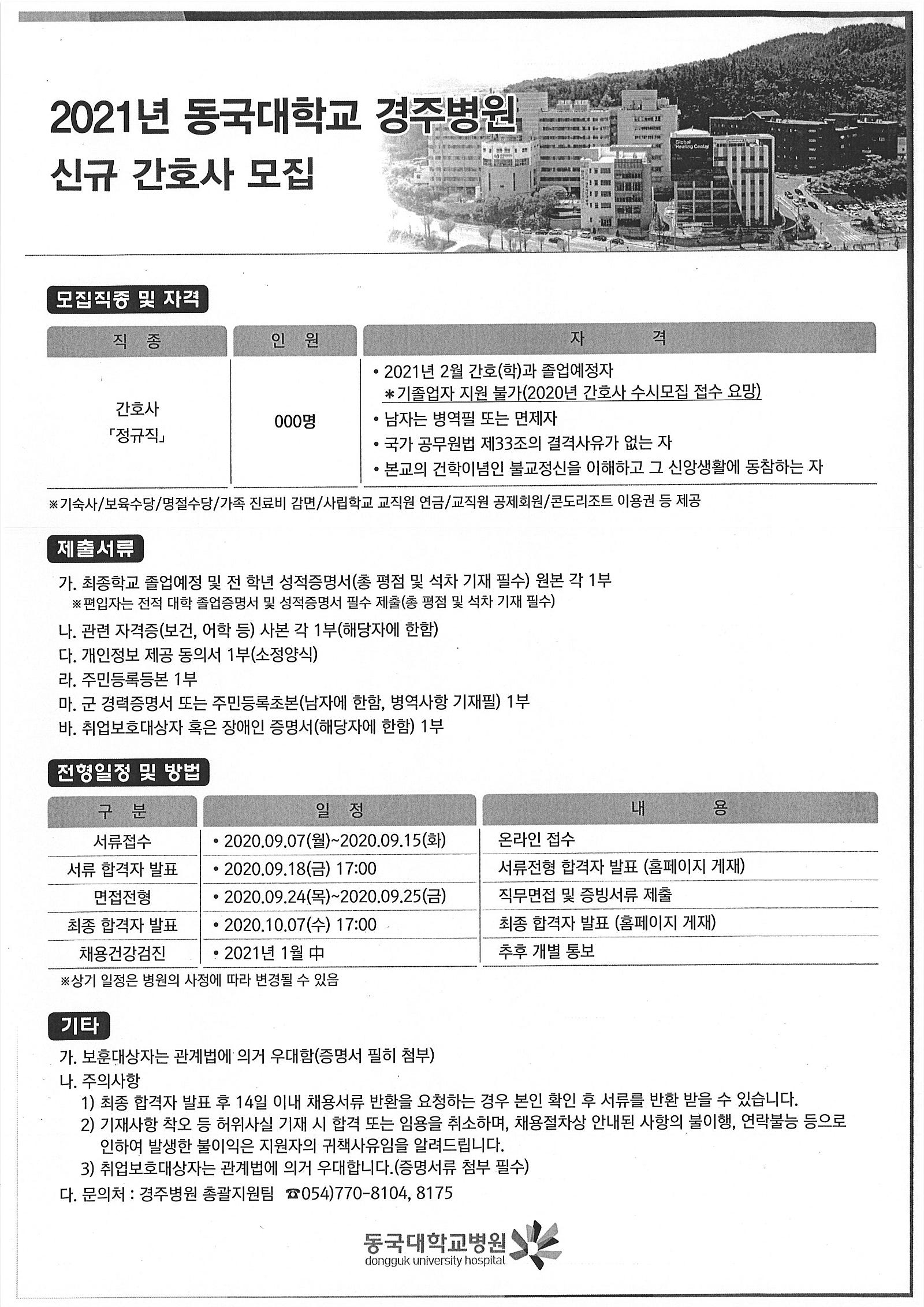 2021 동국대학교경주병원 신규간호사 채용 안내 페이지 정보 작성자 간호학과 댓글 0건 조회 1,754회 작성일 20-09-02 17:31 목록 본문 이전글2021 대자인병원 신규간호사 모집 공고 20.09.04 다음글2021 명지성모병원 간호사 채용 안내 20.09.02