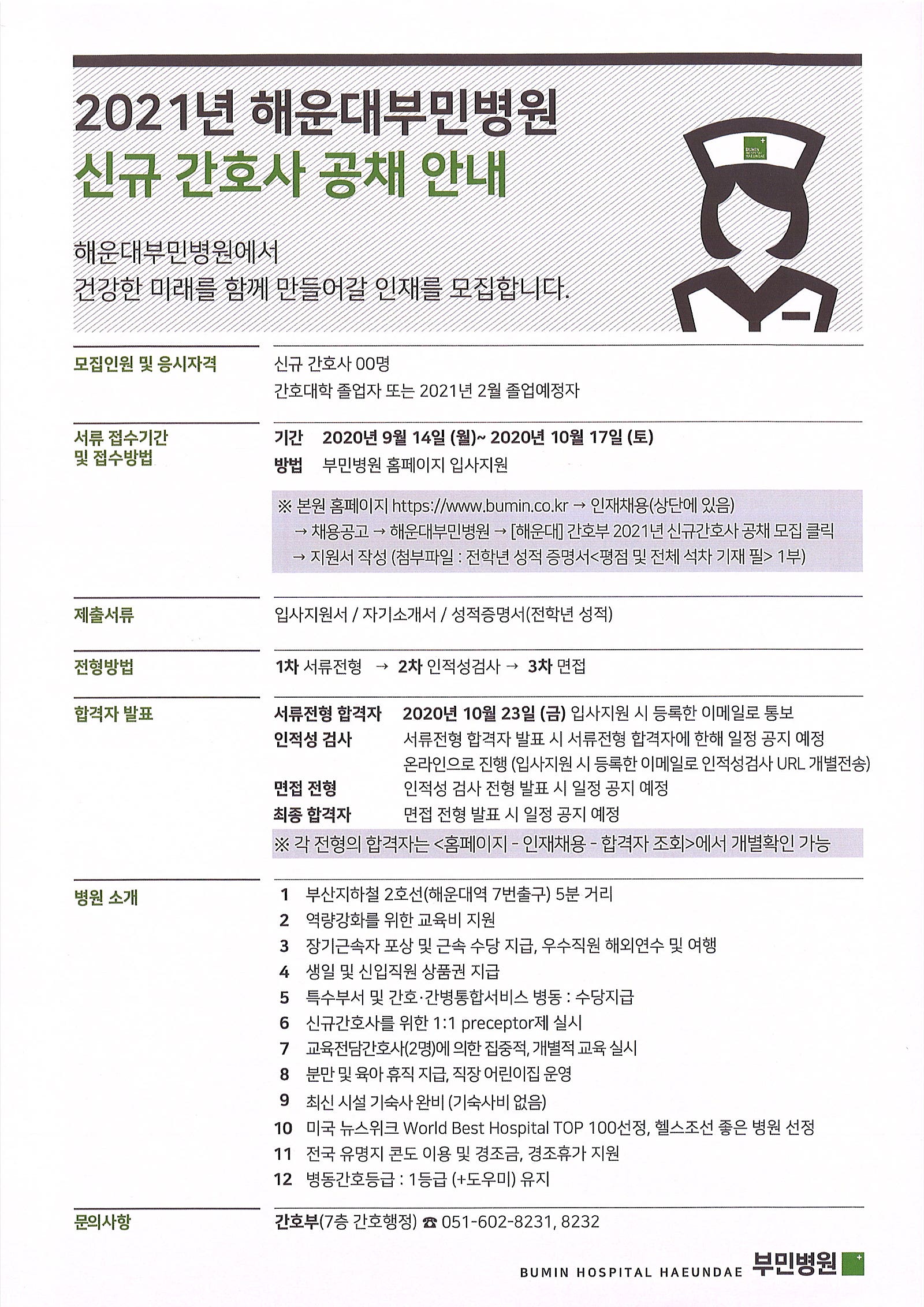 2021 해운대부민병원 신규간호사 채용 안내 페이지 정보 작성자 간호학과 댓글 0건 조회 1,713회 작성일 20-09-08 17:51 목록 본문 이전글2021 한마음창원병원 신규간호사 채용 안내 20.09.08 다음글2021 구포성심병원 신규간호사 채용 공고 20.09.08