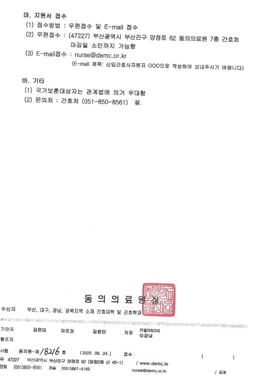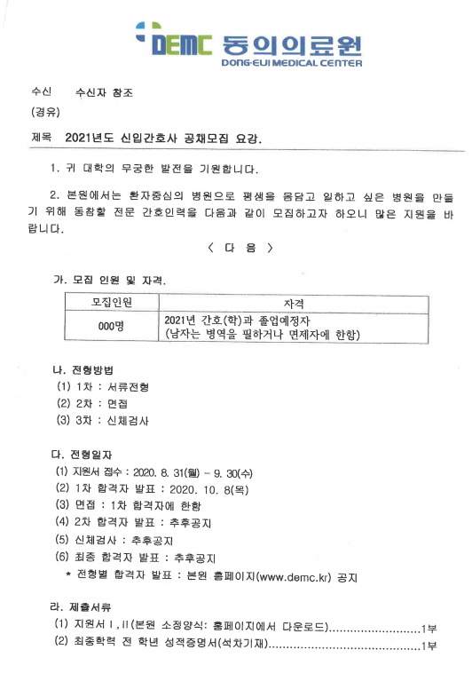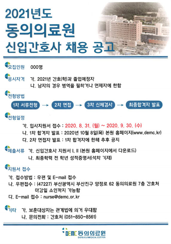 2021 동의의료원 신입간호사 채용 공고 페이지 정보 작성자 간호학과 댓글 0건 조회 1,774회 작성일 20-08-26 15:19 목록 본문 이전글2021 백제종합병원 신규간호사 채용 공고 20.08.31 다음글2021 나은병원 신규간호사 채용 공고 20.08.25