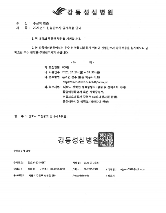 2021 강동성심병원 신규간호사 채용 공고 페이지 정보 작성자 간호학과 댓글 0건 조회 2,170회 작성일 20-07-17 13:42 목록 본문 이전글2021 계명대학교 동산병원 신규간호사 공개경쟁채용 공고 20.07.20 다음글2021 SMG 연세병원 신규.경력 간호사 모집 공고 20.07.17