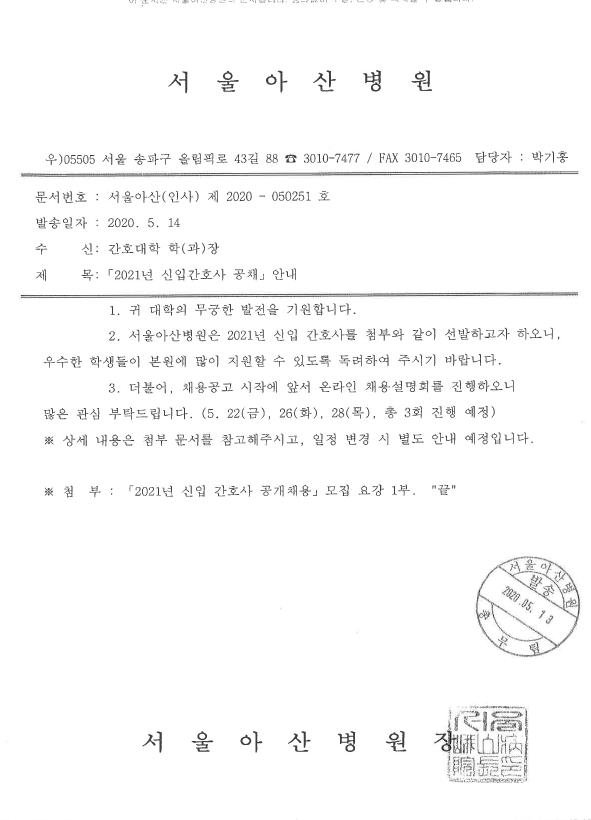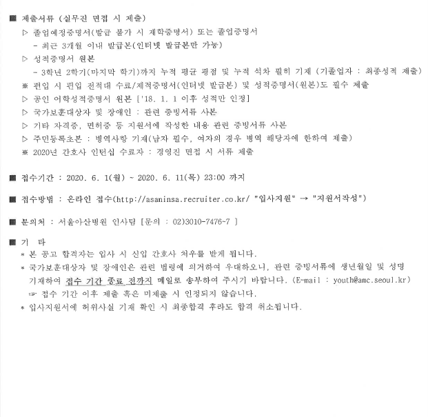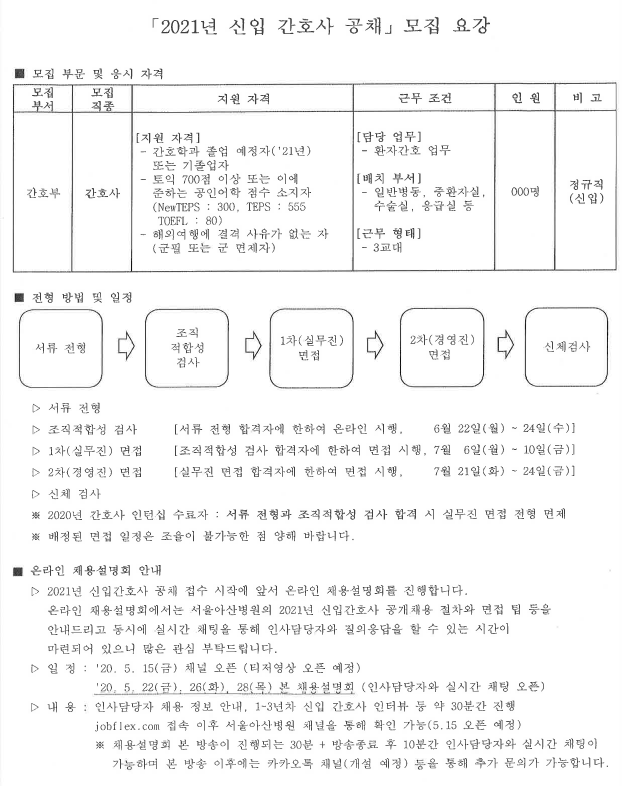 2021년 서울아산병원 신입간호사 공채 안내 페이지 정보 작성자 간호학과 댓글 0건 조회 2,432회 작성일 20-05-15 14:31 목록 본문 이전글2021 삼성서울병원 신입간호사 채용 공고 20.05.25 다음글2020 힘센병원 신규간호사 채용 공고 20.02.21