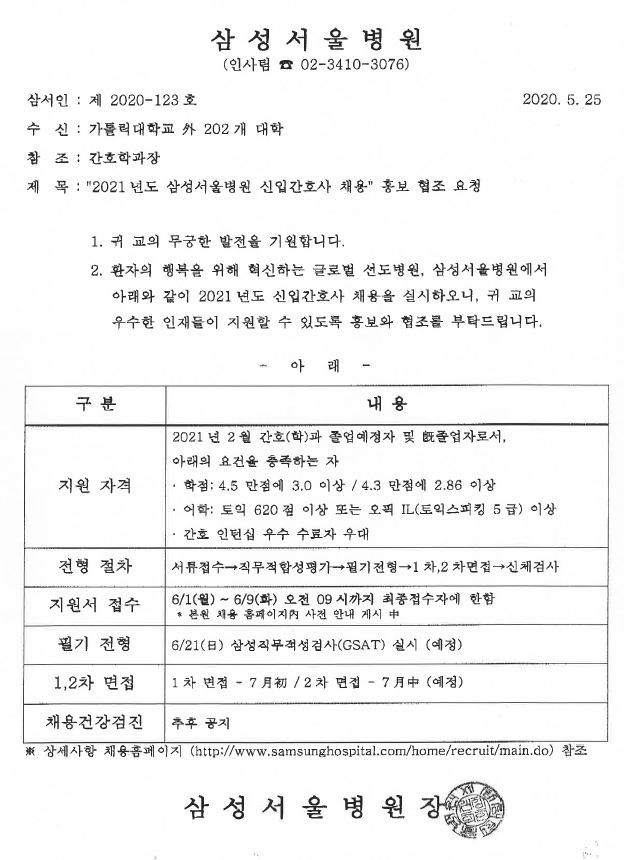 2021 삼성서울병원 신입간호사 채용 공고 페이지 정보 작성자 간호학과 댓글 0건 조회 2,383회 작성일 20-05-25 16:02 목록 본문 이전글2020 서울대학교병원 신규 간호직 채용 안내 20.06.05 다음글2021년 서울아산병원 신입간호사 공채 안내 20.05.15