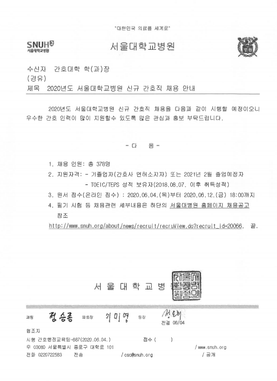 2020 서울대학교병원 신규 간호직 채용 안내 페이지 정보 작성자 간호학과 댓글 0건 조회 2,347회 작성일 20-06-05 11:53 목록 본문 이전글2021 연세대학교 의료원 신규간호사 채용 안내 20.06.08 다음글2021 삼성서울병원 신입간호사 채용 공고 20.05.25