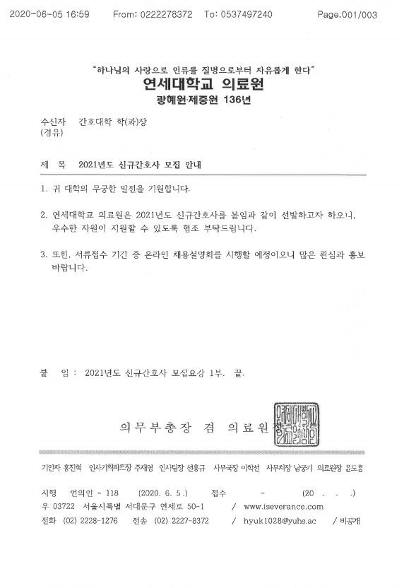 2021 연세대학교 의료원 신규간호사 채용 안내 페이지 정보 작성자 간호학과 댓글 0건 조회 2,427회 작성일 20-06-08 09:06 목록 본문 이전글2021 분당서울대학교병원 신입간호사 채용 공고 20.06.11 다음글2020 서울대학교병원 신규 간호직 채용 안내 20.06.05