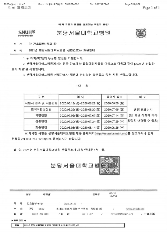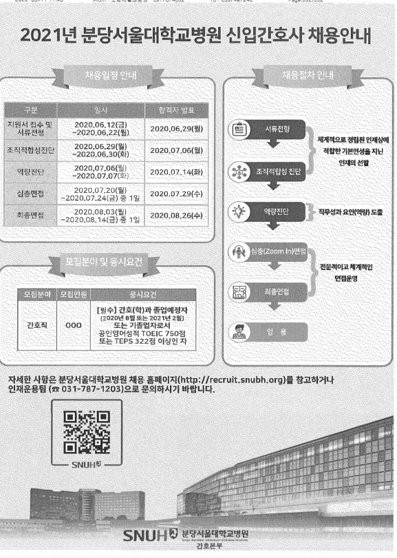 2021 분당서울대학교병원 신입간호사 채용 공고 페이지 정보 작성자 간호학과 댓글 0건 조회 2,357회 작성일 20-06-11 13:41 목록 본문 이전글2021 메리놀병원 신규간호사 채용 공고 20.06.11 다음글2021 연세대학교 의료원 신규간호사 채용 안내 20.06.08