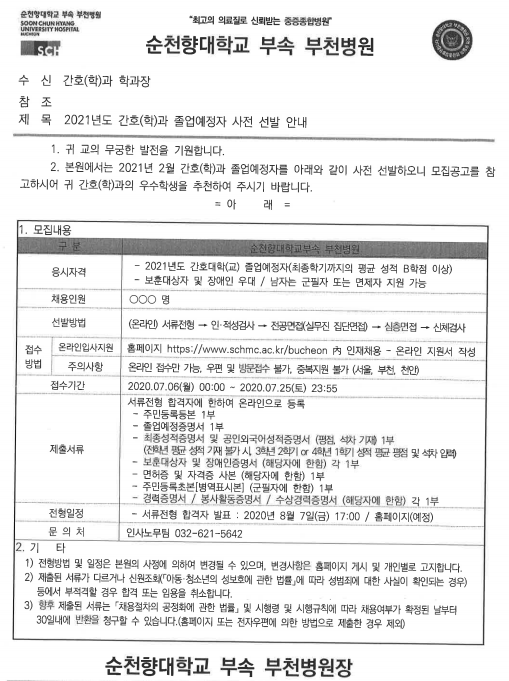 2021 순천향대학교 부속 부천병원 채용 공고 페이지 정보 작성자 간호학과 댓글 0건 조회 2,019회 작성일 20-07-06 14:55 목록 본문 이전글2021 순천향대학교 부속 천안병원 채용 공고 20.07.06 다음글2021 문경제일병원 채용 공고 20.07.03