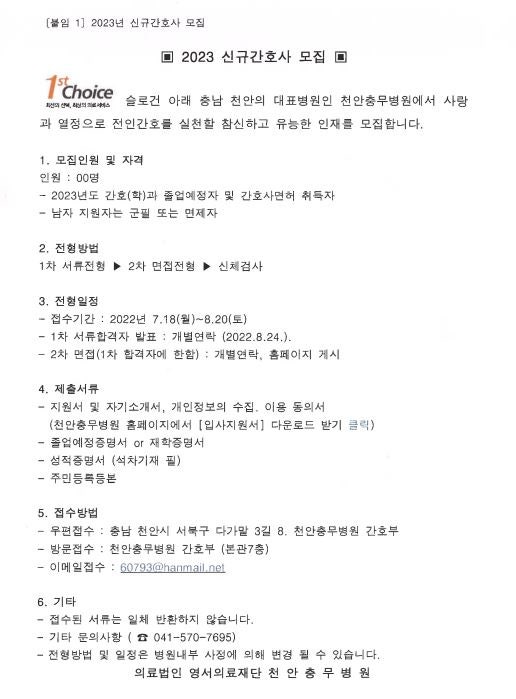 2023 천안충무병원 신규간호사 채용 안내 페이지 정보 작성자 간호학과 댓글 0건 조회 1,334회 작성일 22-08-01 13:23 목록 본문 이전글2023 포항세명기독병원 신규간호사 채용 안내 22.08.02 다음글2023 가톨릭대학교 대전성모병원 신규간호사 채용 안내 22.08.01