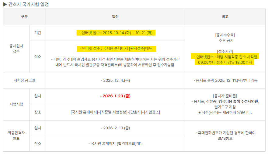 일반 2026년도 제66회 간호사 국가시험 응시원서 접수 안내 페이지 정보 작성자 간호학과 댓글 0건 조회 180회 작성일 25-10-13 15:47 목록 본문 학생들의 합격을 위하여 관련 정보를 공유합니다. 위의 기간에 맞추어 시험 준비하시기 바랍니다. ※국시원 홈페이지 : 한국보건의료인국가시험원 이전글[교직] 제 5회 모의수업 경진대회 안내 25.10.17 다음글[교직] 교직과정 교육봉사활동 포트폴리오 양식 25.10.02
